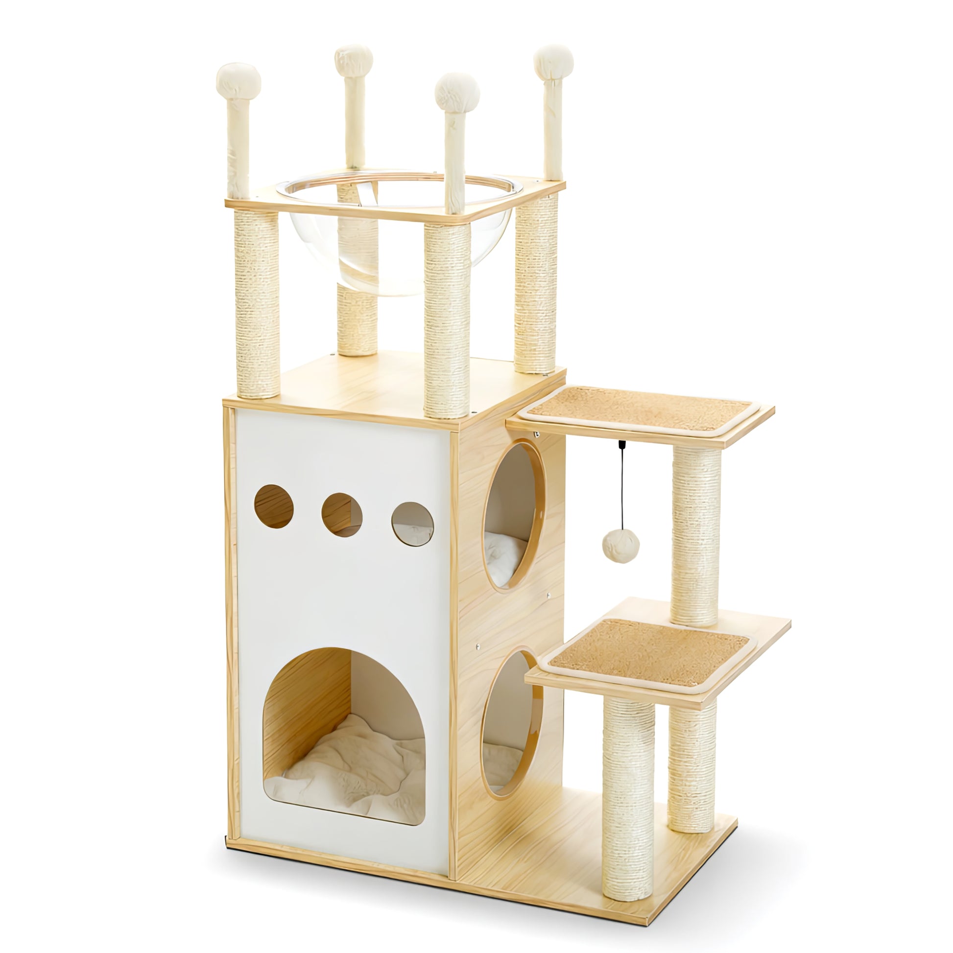 Les surfaces en bois clair se nettoient avec un chiffon humide. Les poteaux en sisal se dépoussièrent facilement, et un brossage régulier suffit pour retirer les poils.