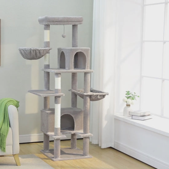 Oui. La structure supporte jusqu’à 30 kg et propose 6 zones de repos (2 niches, 2 perchoirs, 2 hamacs) pour éviter les conflits.